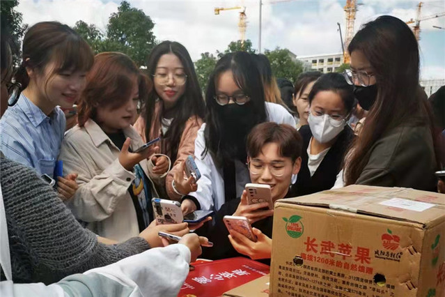 海陵区青年商会又一次加入到扶贫接力工作中来,青商会执行会长李凯来到活动现场主动认购100箱长武苹果并转赠予学院的家庭经济困难员工。
